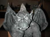 Greyhaunt Manor 2004 - Donations PillarWinston is a big resin gargoyle who used to be the base of a table. Hand-sculpted Sculpy horns painted with acrylic paint were added to the top of his head and the tips of his wings to hide the pegs where the glass tabletop used to sit. Acrylic paint was used to add some color to his eyes, teeth and various other bits. A coating of Ritz Whitener makes his eyes glow under blacklight. The pillar is a cardboard concrete form covered with carpet. A red floodlight placed inside the pillar shines up through a hole under the "Donations" sign, making the letters glow. |